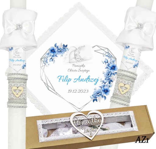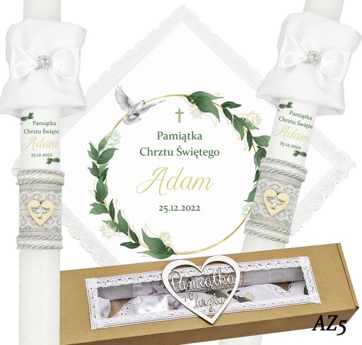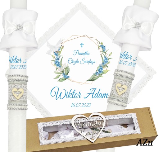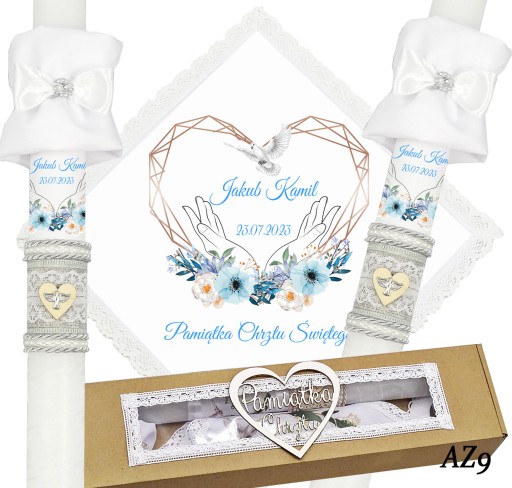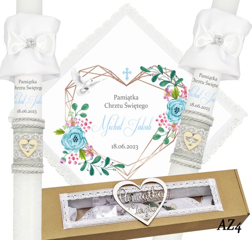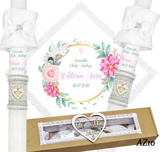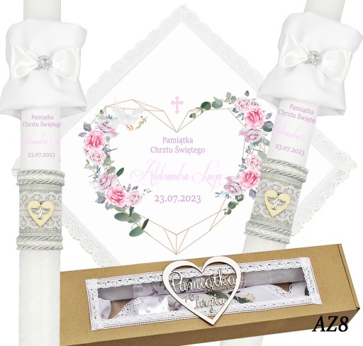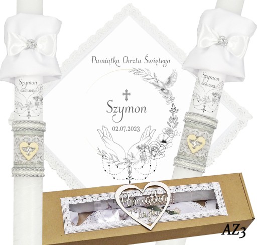 Prezentujemy niezwykły komplet szatki i świecy do chrztu, stworzony z myślą o uroczystym wydarzeniu w życiu każdego dziecka. Szatka wykonana jest z śnieżnobiałego materiału i obszyta bawełnianą koronką, co nadaje jej elegancji i delikatności. Świeca zdobiona jest ręcznie, a na niej umieszczony jest nadruk z imieniem dziecka, co sprawia, że jest to wyjątkowa i niepowtarzalna pamiątka. Świeca posiada srebrny sznurek, na jej powierzchni znajduje się szara jutowa wstążka wraz z koronką oraz drewniane serduszko,na którym znajduje się emblemat Ducha Świętego koloru srebrnego. Pozostała część świecy jest owinięta szyfonową białą wstążką.