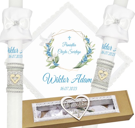 Prezentujemy niezwykły komplet szatki i świecy do chrztu, stworzony z myślą o uroczystym wydarzeniu w życiu każdego dziecka. Szatka wykonana jest z śnieżnobiałego materiału i obszyta bawełnianą koronką, co nadaje jej elegancji i delikatności. Świeca zdobiona jest ręcznie, a na niej umieszczony jest nadruk z imieniem dziecka, co sprawia, że jest to wyjątkowa i niepowtarzalna pamiątka. Świeca posiada srebrny sznurek, na jej powierzchni znajduje się szara jutowa wstążka wraz z koronką oraz drewniane serduszko,na którym znajduje się emblemat Ducha Świętego koloru srebrnego. Pozostała część świecy jest owinięta szyfonową białą wstążką.