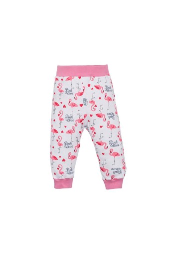 dresowe w kolorze białym z motywem różowych flamingów, wykończone różowymi delikatnymi ściągaczami.
