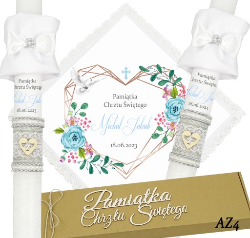 Prezentujemy niezwykły komplet szatki i świecy do chrztu, stworzony z myślą o uroczystym wydarzeniu w życiu każdego dziecka. Szatka wykonana jest z śnieżnobiałego materiału i obszyta bawełnianą koronką, co nadaje jej elegancji i delikatności. Świeca zdobiona jest ręcznie, a na niej umieszczony jest nadruk z imieniem dziecka, co sprawia, że jest to wyjątkowa i niepowtarzalna pamiątka. Świeca posiada srebrny sznurek, na jej powierzchni znajduje się szara jutowa wstążka wraz z koronką oraz drewniane serduszko,na którym znajduje się emblemat Ducha Świętego koloru srebrnego. Pozostała część świecy jest owinięta szyfonową białą wstążką.