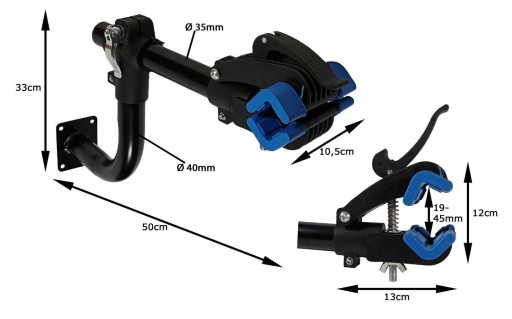 Elementy nośne wykonane z kompozytu stali i tworzywa sztucznego; szybkie i łatwe zaciskanie jedną ręką do mocowania 19-45mm; obciążenie do 18 kg