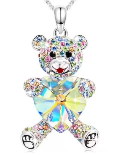 Ожерелье с плюшевым мишкой, серебро, многоцветное сердце, кубические цирконы, милые красивые