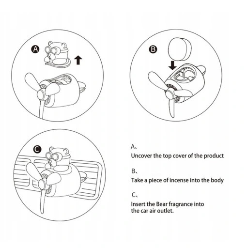 Design retro-Inspiracja z samolotu napędzanego śmigłem.Ostrze obraca się gładko, gdy odpowietrznik samochodowy jest włączony.Następnie zapach emituje świeży zapach-Wszystkie kłopoty z powrotem za głową-Tylko na pierwszym ustawieniu klimatyzacji lub ogrzewania, będziesz miał swojego wentylatora! Po prostu ciesz się! Przyjdź i przenieś romantyzm w podróż samochodem!