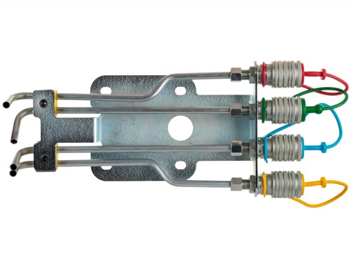 W zestawie oprócz wspornika są cztery szybkozłącza gniazda euro, zaślepki ochronne do gniazd, mocowania rurek, cztery rurki oraz przyłącza do rurek.