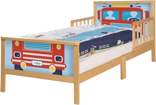 Świetnej jakości drewniane łóżko z drzewa bukowego. Podwyższenie przy głowie i nóżkach z motywem samochodu. Przy głowie zabezpieczająca barierka.