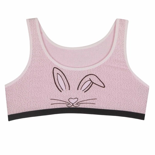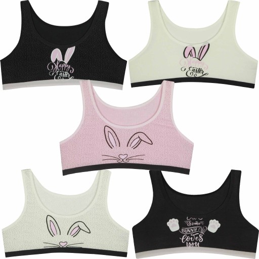 Śliczny zestaw 5 sztuk biustonoszy dziecięcych z nadrukowanym słodkim królikiem. W zestawie staniczki w pięciu kolorach. Oferowane produkty przez LILLY BLING są świetnej jakości, elastyczna, niecisnąca gumka to idealna propozycja na zajęcia sportowe jak również na co dzień.