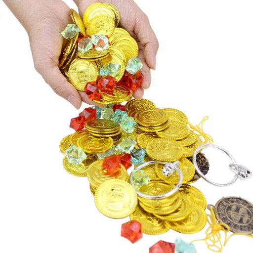 ✅Pakiet złotych monet i pirackich klejnotów w różnych kolorach; Wykonane z bezpiecznego ABS. Zalecane dla dzieci 4+ lat. Idealny na rekwizyty sceniczne, dekoracje centralne, dekoracje imprezowe, dekoracje na Halloween, skrzynia na skarby, klejnoty skarbów.