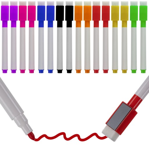 Flamastry, które doskonale sprawdzą się jako markery do tablicy magnetycznej. Niewątpliwą zaletą takiego rozwiązania jest fakt, że zapisane na tablicy notatki w łatwy sposób możemy usunąć za pomocą suchej ściereczki lub gąbki, która jest w zatyczce.