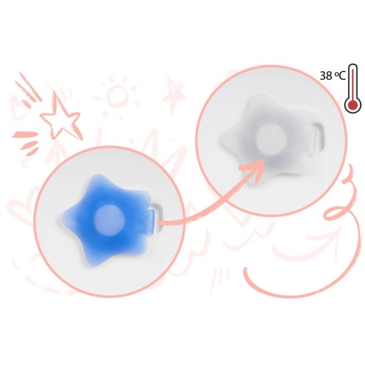 Korek w kształcie gwiazdki zmieni swój kolor z niebieskiego na biały, jeśli temperatura wody przekroczy 38°C.