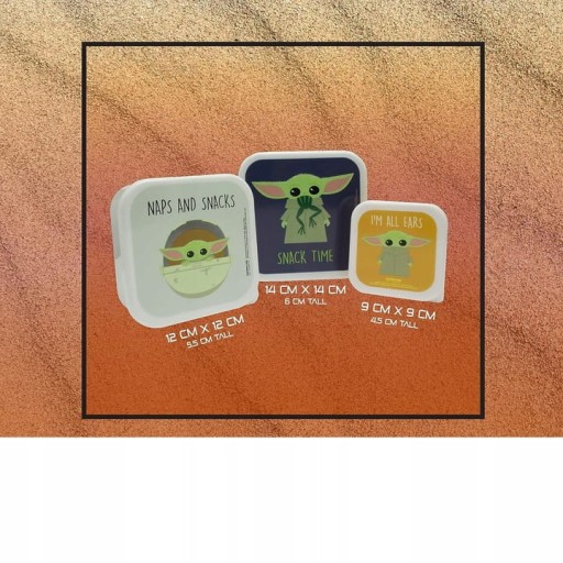 Super zestaw pudełeczek na żywność dla naszego malucha i nie tylko. Zestaw przydatny zarówno w szkole jak i na wycieczce czy wyjeździe. Pudełeczka wykonane z wysokiej jakości tworzywa sztucznego, przystosowane do kontaktu z żywnością. Produkt na licencji. Pudełka trzech różnych wielkości, dopasowane tak aby jedno mieściło się w kolejne. Dzięki temu mamy 3 różne pudełeczka, które łatwo i wygodnie przechowujemy, nie zajmują dużo miejsca, a zawsze możemy sobie dobrać wielkość pudełka do ilości jedzenia jakie chcemy zabrać ze sobą lub przechować. Fantastyczny zestaw dla malucha i nie tylko.