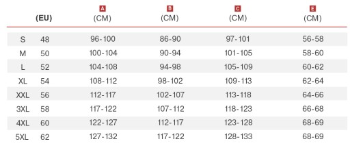 - Rozmiar 5XL - Obwód klatki (cm): 127-132, Obwód pasa (cm): 117-122, Obwód bioder (cm): 128-133, Dł. rękawa zew. (cm): 68-69