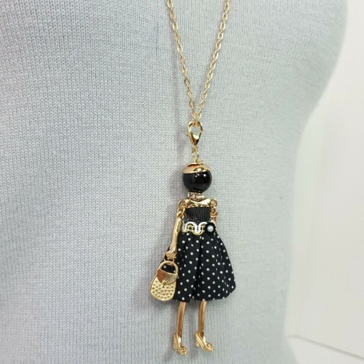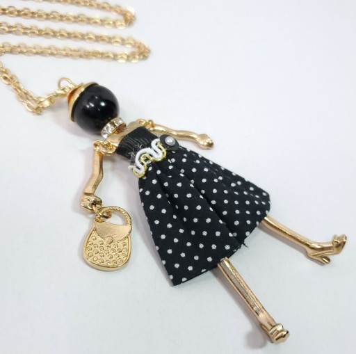 ORYGINALNY I PIĘKNY NASZYJNIK Z ZŁOTO-CZARNĄ LALKĄ Z TOREBKĄ