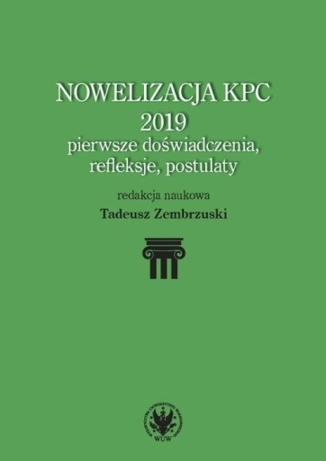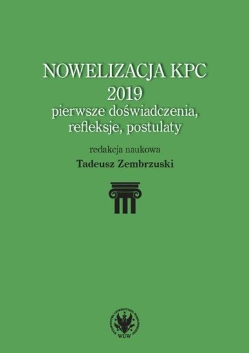 Zbiór tekstów poświęconych dokonanej w 2019 roku obszernej nowelizacji Kodeksu postępowania cywilnego, zmieniającej podstawy, na których osadzone jest cywilne prawo procesowe. Autorzy wskazują na liczne luki, mankamenty i niespójności wynikające z jednoczesnego modyfikowania wielu konstrukcji i instytucji, poszukują odpowiedzi na pytania o charakter, zakres, znaczenie i skutki dokonywanych modyfikacji oraz ich wpływ na przebieg sporów sądowych. Zastanawiają się nad rozwiązaniami mogącymi zapobiec rosnącym utrudnieniom stosowania KPC nie tylko dla stron i uczestników postępowań sądowych, lecz także dla sędziów i zawodowych pełnomocników. The Amendment to the Code of Civil Procedure of 2019 – First Experiences, Reflections and Demands A collection of texts devoted to the 2019 major amendment to the Code of Civil Procedure, which changed the fundamentals of the civil procedural law. The authors point to numerous loopholes, flaws and inconsistencies resulting from parallel modification of many structures and institutions, seek answers to the questions regarding the character, extent, importance and consequences of the introduced modifications and their influence on litigation. They consider solutions, which could prevent increasing difficulties in the Code and which could be used not only by the parties and participants in judicial proceedings, but also by judges and attorneys.