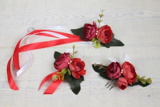 Wykonany z kwiatów kamelii w odcieniach czerwieni, zdobiony gałązkami eukaliptusa, kremową hortensją, liśćmi i perełkami.