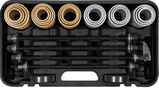 Komplet 26 elementów do wyprasowywania/ wprasowywania tulei metalowo-gumowych na samochodzie bez konieczności demontażu wahaczy czy belek.
