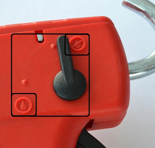 Pozycja GÓRNA - wyciskanie tuby elastyczne, po naciśnięciu spustu, tłok przesuwa się i w przypadku jakiegokolwiek oporu cofnie się, przy tym nie zalewając masą powierzchni.