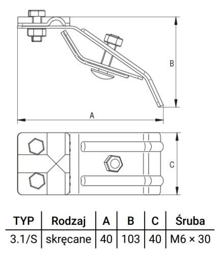 Służy do mocowania drutu odgromowego do rynny, ta wersja pozwala prowadzić drut w dwóch kierunkach.Wersja: ocynkowana A=40B=40c=40