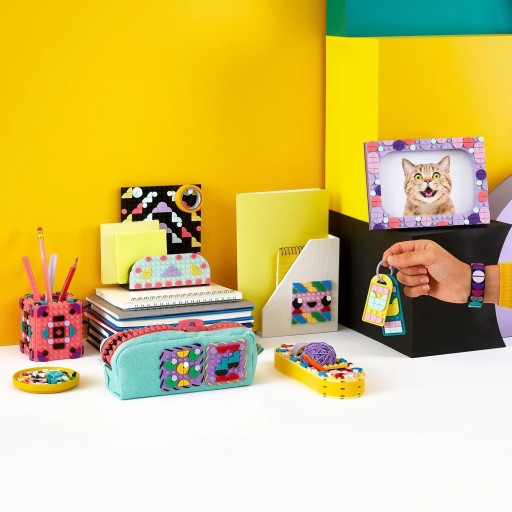 Szukasz wysokiej jakości zestawu dla ośmioletnich i starszych miłośników rękodzieła? Zestaw narzędzi projektanta — wzorki LEGO® DOTS (41961) zrobi wrażenie na wszystkich. Zawiera dziesięć różnych modeli DOTS do ozdobienia, w tym bransoletkę z dwoma rzędami wypustek, nalepki, naszywki, dwie zawieszki, organizer biurkowy, pojemnik na ołówki, tackę na notatki i dużą ramkę na zdjęcie.