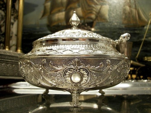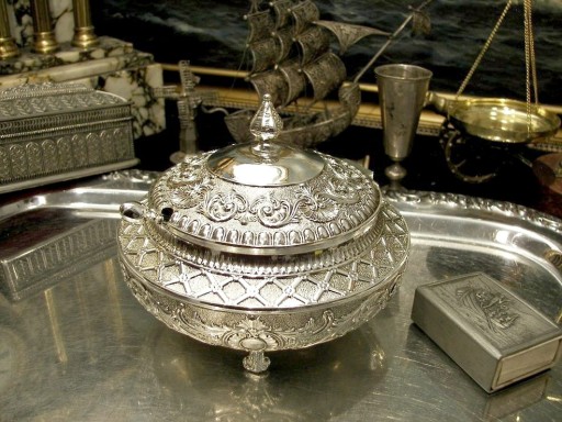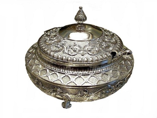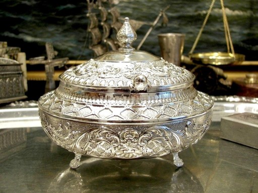 Cukiernica jest fantastycznie zdobiona, bogactwo różnorodnych, przestrzennych szlaczków sprawia, że przedmiot wydaje się być jak wyjęty z baśni tysiąca i jednej nocy.