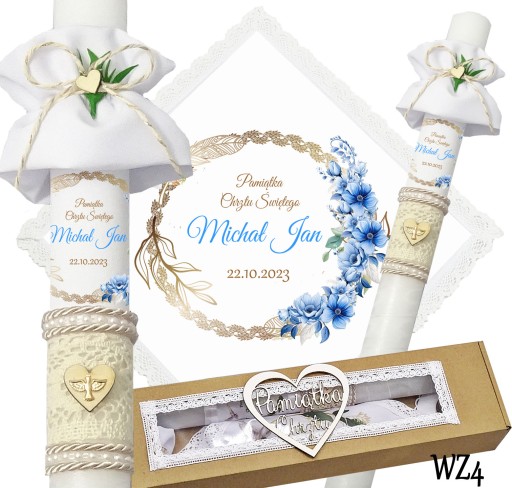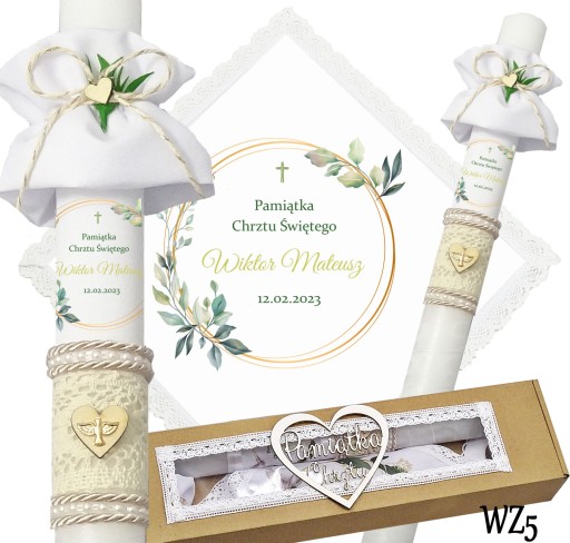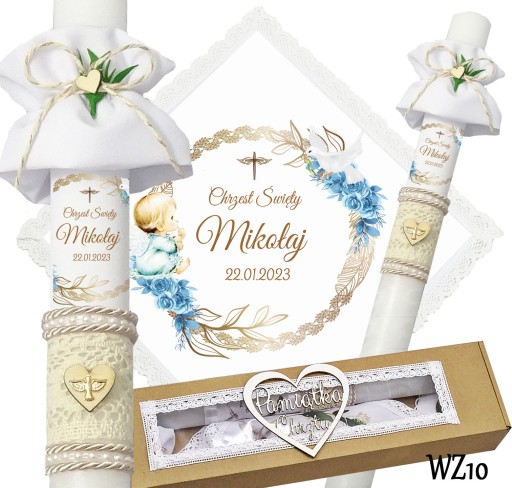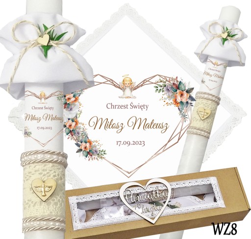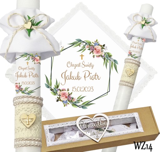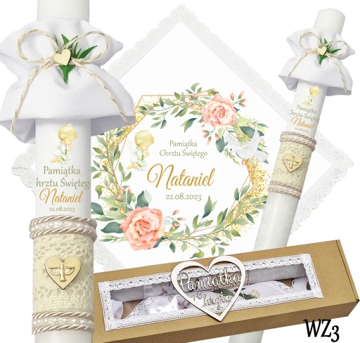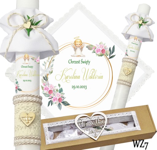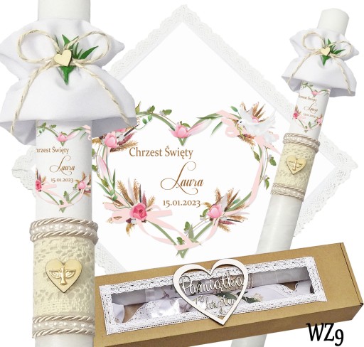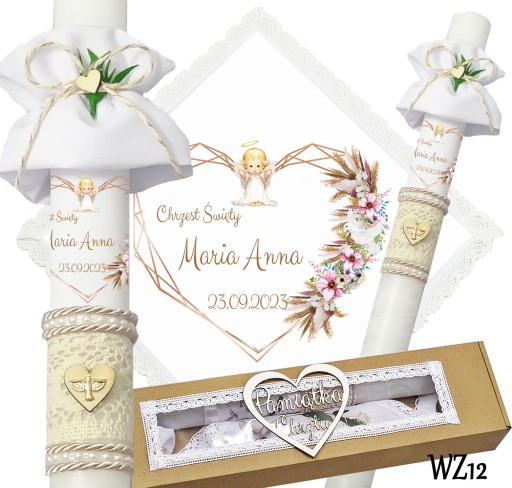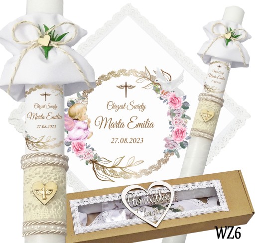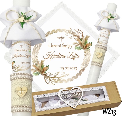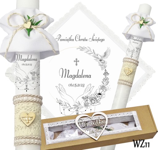Prezentujemy niezwykły komplet szatki i świecy do chrztu, stworzony z myślą o uroczystym wydarzeniu w życiu każdego dziecka. Szatka wykonana jest z śnieżnobiałego materiału i obszyta bawełnianą koronką, co nadaje jej elegancji i delikatności. Świeca zdobiona jest ręcznie, a na niej umieszczony jest nadruk z imieniem dziecka, co sprawia, że jest to wyjątkowa i niepowtarzalna pamiątka. Świeca posiada beżowy sznurek, na jej powierzchni znajduje się koronka oraz drewniane serduszko,na którym znajduje się emblemat Ducha Świętego koloru złotego. Pozostała część świecy jest owinięta szyfonową białą wstążką. Wszystko to zapakowane jest w kartonowe a do kompletu dodajemy jeszcze materiałową profitkę. Ten wyjątkowy zestaw szatki i świecy z pewnością podkreśli uroczystość chrztu i wzmocni emocje i wspomnienia związane z tą wyjątkową okazją.