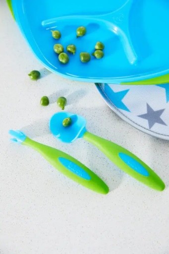 Komplet innowacyjnych sztućców dla niemowląt zaprojektowany we współpracy z dziecięcym terapeutom zajęciowym. Idealny do nauki samodzielnego jedzenia.