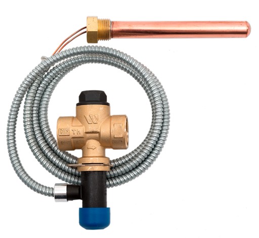 Termostatyczny upustowy zawór bezpieczeństwa. Tuleja z dwoma czujnikami termicznymi, długość 145 mm, gwint zewnętrzny 1/2”, różne temperatury zadziałania (wskazane w tabeli poniżej). Maksymalny przepływ z otwartym zaworem 6500 l/godz. przy ciśnieniu 8 bar. Maksymalna wydajność zrzutowa przy temperaturze 107°C.