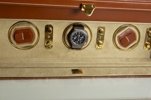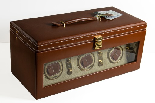 Luksusowy rotomat na 3 zegarki z dodatkową półką i kieszonka na 10 zegarków oraz inne dodatki. Nad kieszonką wbudowane lustro. Bardzo dobrej jakości skóra naturalna w kolorze jasnego brązu. Bardzo dobra jakość i technika znana m.in. z rotomatów Wolf Heritage Double Storage.