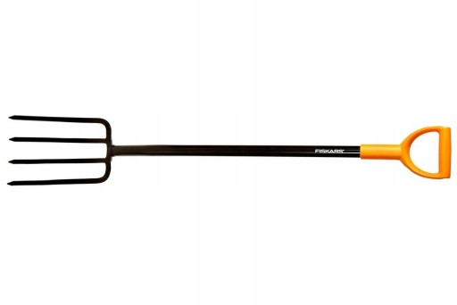 Widły do kopania ergonomiczne Fiskars. Hartowana głowica z najwyższej jakości stali. Wygięty stalowy trzonek pokryty PCV. Wygodny uchwyt z tworzywa. Dane techniczne: Szerokość wideł: 170 mm. Ciężar wideł: 2100 g. Długość wideł: 1220 mm.