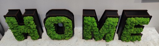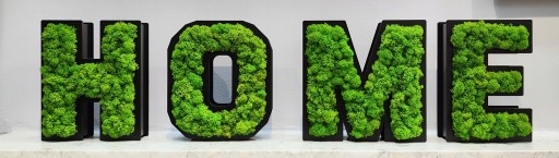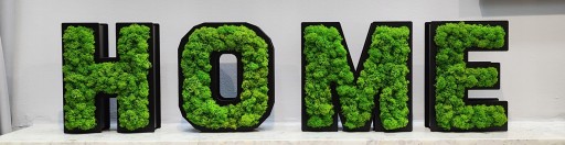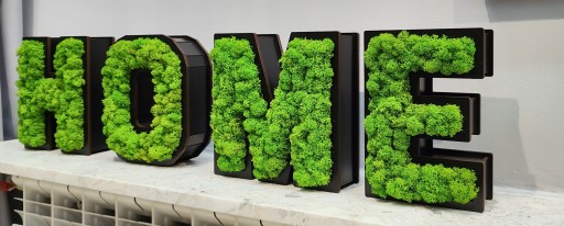Stojący, przestrzenny napis "HOME" z mchem.