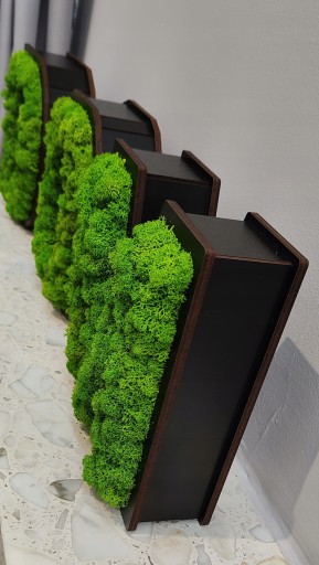 Litery wykonane z drewnianych płyt HDF. Wypełnienie stanowi mech (porost). Mech, który użyłam jest stabilizowany. By "żył", potrzebuje wilgoci, którą sam pobiera sobie z otoczenia. Nie trzeba go spryskiwać, przycinać czy zraszać. Mech jest antystatyczny i antyalergiczny.