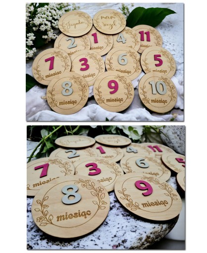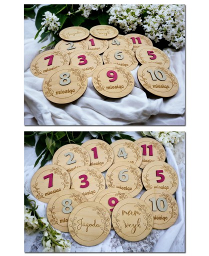 Zestaw zawiera 14 sztuk tabliczek: jedna z imieniem, a pozostałe z miesiącami życia maluszka.