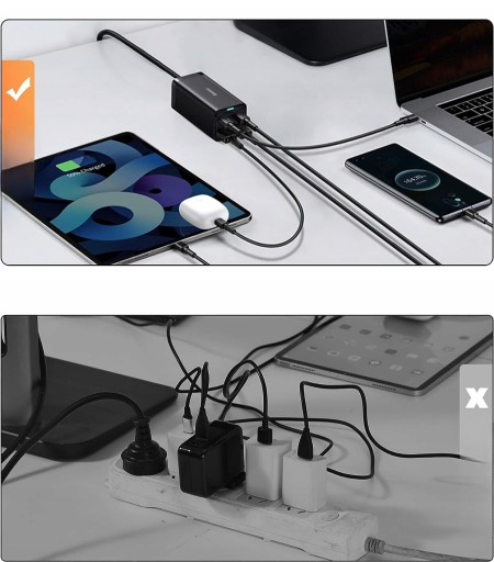 - Mniejszy rozmiar, większa moc: Ta ładowarka biurkowa GaN 100 W jest o 10% mniejsza niż produkt GaN2 bez utraty wydajności i o 60% mniejsza niż oryginalna ładowarka USB C 93 W, zajmuje mniej miejsca i utrzymuje porządek na biurku podczas ładowania telefonu, tabletu, laptopa.