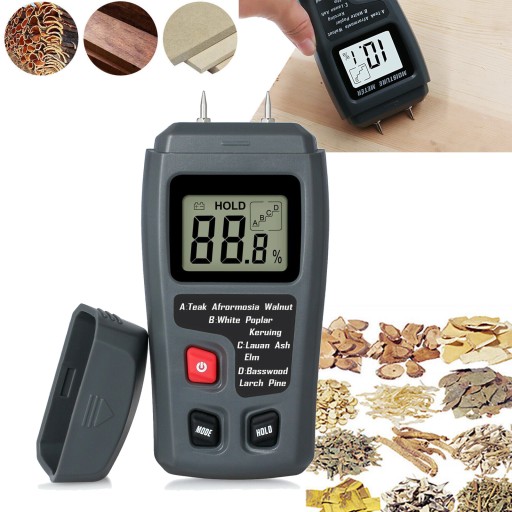 Wilgotnościomierz do drewna Dokładność 0,5%, 4 różne tryby, pomiar drewna i materiałów budowlanych/syntetycznych. 50 popularnych rodzajów drewna do pomiaru różnych rodzajów drewna. Można użyć "autotestu" wbudowanego w nasadkę, aby upewnić się, że przyrząd jest prawidłowo skalibrowany przed użyciem.