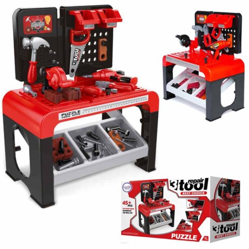 BOGATO WYPOSAŻONY WARSZTAT to świetny zestaw złożony z wielu elementów w dominującym kolorze czerwonym, solidne wykonany z dbałością o szczegóły. Dzięki niemu każdy może stać się profesjonalistą i ciąć, wiercić, skręcać i montować. Zestaw wyposażony został w wiele półek, szafek i wieszaków, na których można umieszczać narzędzia, a tym samym uczymy dziecko utrzymania porządku w miejscu zabawy i pracy. Dzięki tej zabawce Twoje dziecko zgłębi tajniki pracy w warsztacie i dodatkowo pozna do czego służą poszczególne narzędzia.