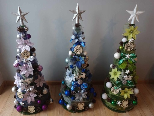 Wybieracie Państwo ogólną kolorystykę choinek która może się różnić od pokazanych zdjęć (proszę pamiętać iż jest to praca ręczna- artystyczna, a nie maszynowa! Nie otrzymacie Państwo choinki identycznej jak na zdjęciu lecz bardzo podobną!). Ogólnie zachowujemy kolorystkę choinki np. srebrno- czerwona.