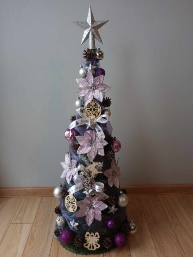 Wykonujemy choinki z dekoracją w kolorze: srebrnym, białym, złotym, niebieskim, czerwonym, brązowym, zielonym, fioletowym lub mieszanym np. złoto-czerwona.