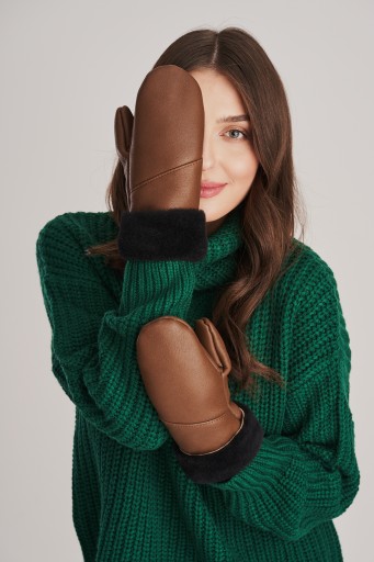 Damskie rękawiczki skórzane jednopalczaste wykonane z najwyższej jakości skór jagnięcych. Bardzo ciepłe i wygodne, od środka wykończone naturalnym futerkiem. Rękawiczki w odcieniach ciepłego brązy z jasnym obszyciem.