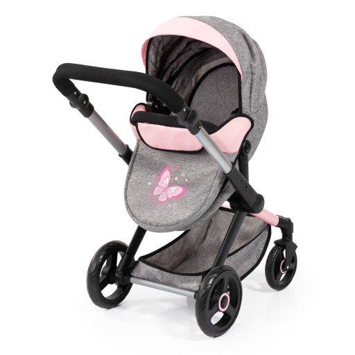 Śliczny wózek szaro-różowej kolorystyce, z aplikacją motylka, zachwyci każdą "małą mamę"