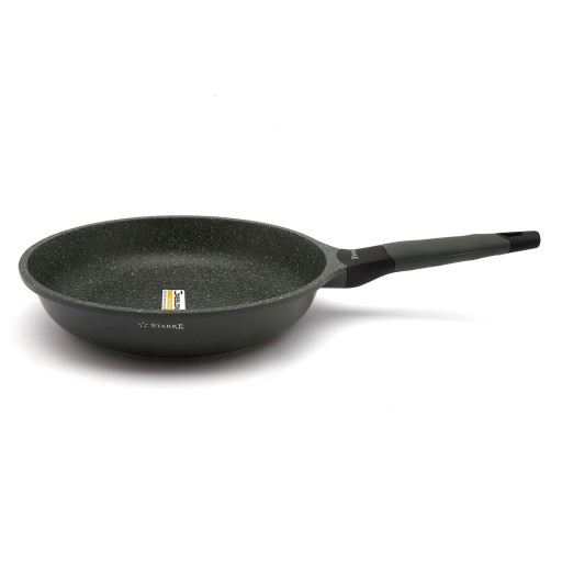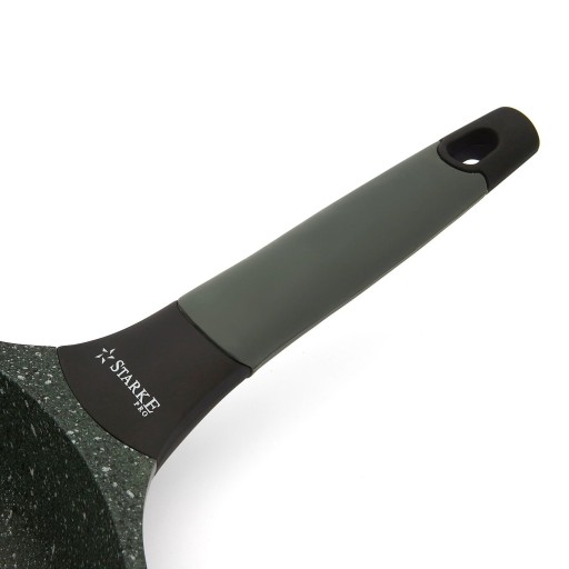 Uniwersalne patelnie marmurowe na indukcję Starke Pro Viridi 20 / 24 / 28 cm wykonane są z aluminium. Do ich stworzenia wykorzystano technikę jednorodnego odlewu die cast. Dzięki temu są świetnie wyważone i bardzo wytrzymałe pod względem mechanicznym oraz termicznym. Podwyższoną trwałość zapewnia im również żaroodporna farba silikonowa, którą pokryto korpusy z zewnątrz. Wnętrze patelni wykończono powłoką marmurową GREBLON C3 wzbogaconą o drobinki granitu. Jej wysoka jakość, doskonała przyczepność, twardość oraz 3-warstwowa struktura zostały opracowane przez niemiecką firmę WEILBURGER. Ma też oznaczenie PFOA Free. Energooszczędność zestawu patelni zapewnia dno indukcyjne o grubości 4,5 mm. To dzięki niemu możesz używać 3 patelni marmurowych Viridi na każdej kuchence. Powłoka nieprzywierająca umożliwi ci dodatkowo smażenie na niewielkiej ilości tłuszczu oraz bezproblemową pielęgnację. Zniesie przy tym aż 8000 cykli ścierania, czyli czterokrotnie więcej niż zwykłe patelnie non-stick dostępne na rynku. Przenoszenie i użytkowanie naczyń ułatwiają rączki soft touch, która się nie nagrzewają i nie wyślizgują z dłoni. Stworzysz z nimi swój własny zestaw naczyń kuchennych z serii Viridi – do domowego użytku poleca je Piotr Kucharski, który osobiście sprawdził możliwości oraz jakość patelni marmurowych. Produkt ma 5 lat gwarancji. Oprócz tego zyskasz możliwość precyzyjnego dozowania składników sypkich i płynnych przy pomocy 5 miarek kuchennych (1,25-15 ml). Komplet pozwoli ci dobrze wyposażyć domową kuchnię na lata.