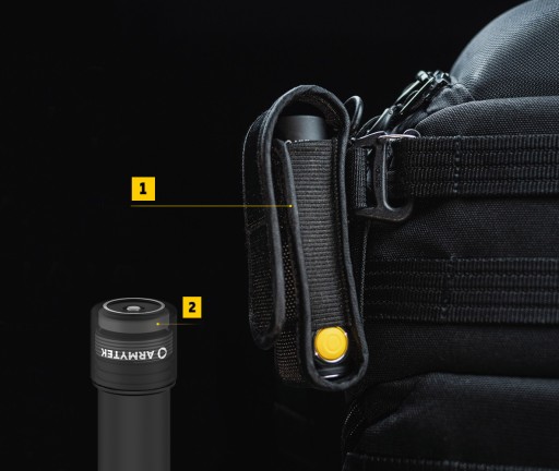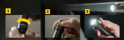 1️⃣ Odkręć tylną zakrętkę wyłączonej latarki o 1/4, naciśnij przycisk i trzymając wciśnięty zakręć zakrętkę.