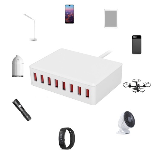 🌈- Dzięki 8 portom USB A i łącznej mocy 50W możesz ładować jednocześnie swój telefon, tablet, laptop itp.