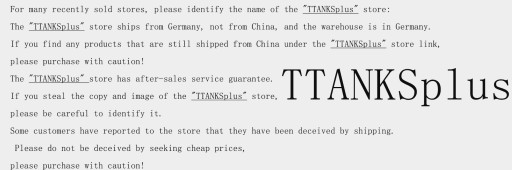 - Sklep "TTANKSplus" wysyła z Niemiec, a nie z Chin, a magazyn znajduje się w Niemczech. Jeśli znajdziesz jakiekolwiek produkty, które nadal są wysyłane z Chin pod linkiem sklepu "TTANKSplus", zakup z ostrożnością!