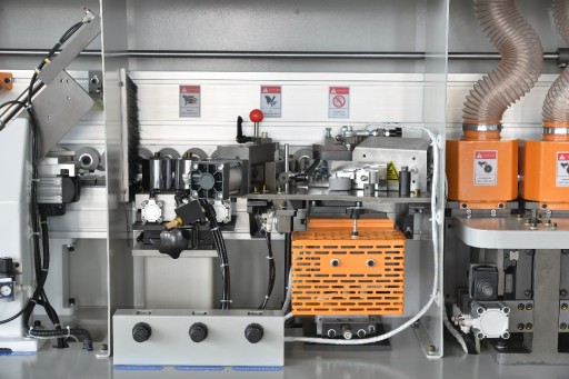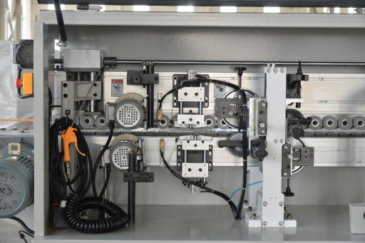 Prowadnica liniowa pod kątem 45 stopni. Dwa silniki o mocy 2 x 0,37 kW zapewniające wysoką precyzję w obcinaniu nadmiaru obrzeża.