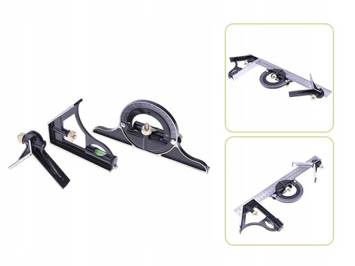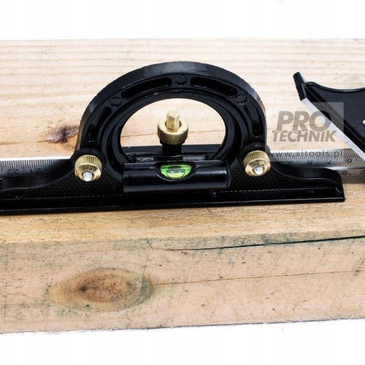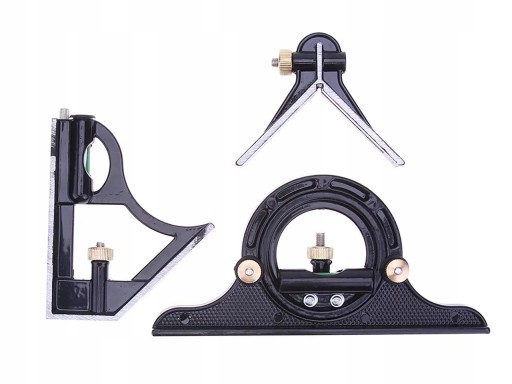 Kątownik wielofunkcyjny złożony. Wyposażony w podziałki metryczną i calową, 2 libelki poziomujące, kątomierz, liniał, przymiar, głębokościomierz, kątownik, kątownik centrujący, kątownik nieprostokątny. Wszystkie części można przesuwać wzdłuż liniału. Kątownik wykonany jest ze stali nierdzewnej, śruby i rysik są mosiężne.