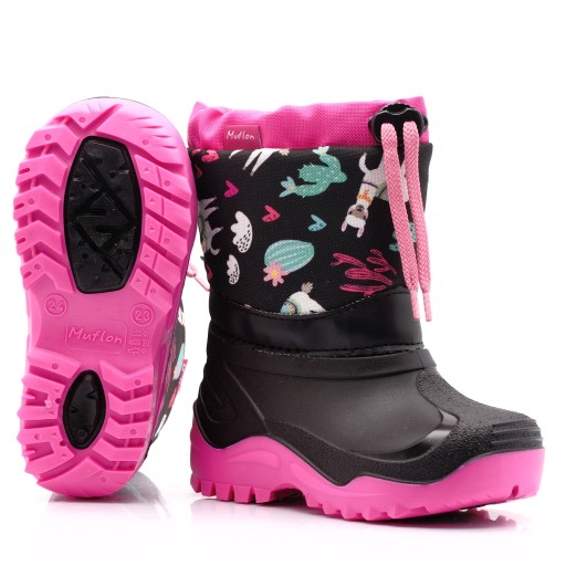 Bardzo ciepłe śniegowce dla dzieci, polskiej firmy MUFLON. Wykonane są z wysokiej jakości materiałów. Górna część cholewki zrobiona jest z ortalionu (zaimpregnowany materiał tekstylny), odporny na przemoczenie ze ściąganym kołnierzem zabezpieczającym przed dostawaniem się wody i śniegu do środka. Buty są ocieplone od wewnątrz naturalną 100 % wełną. Posiadają ocieploną wkładką z folii aluminiowej perforowanej, otoczonej od góry i dołu włókniną, dzięki czemu zachowuje doskonałe właściwości termoizolacyjne.