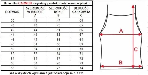 Koszulka Carmen z przedłużanym stanem, na szerokich ramiączkach to klasyka w czystej postaci. Doskonała dla każdej kobiety, uwielbiającej klasyczne rozwiązania, jak i tej kochającej nowoczesne, intrygujące stylizacje.