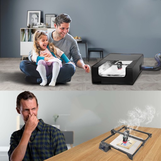 Wyposażony w wentylator wyciągowy i rurę, które przyspieszają cyrkulację powietrza i sprawiają, że laser działa pełniej, eliminując jednocześnie dym i zapach.