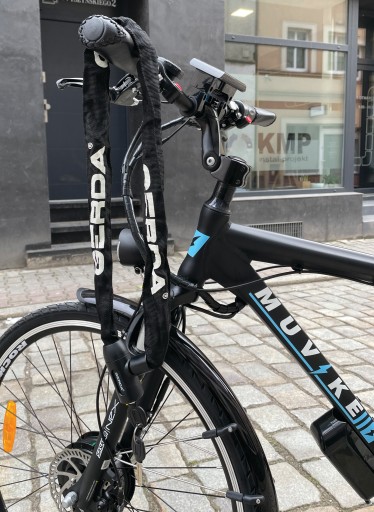 - Zalecamy przypinać rower przez ramę