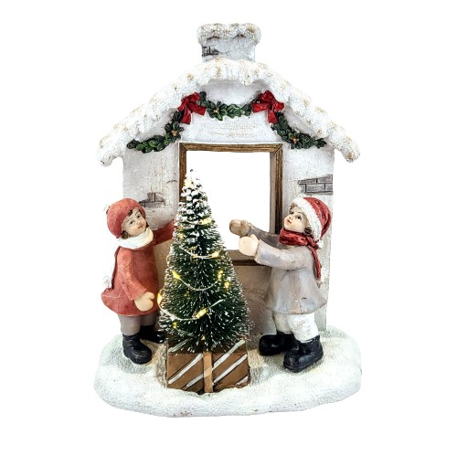 Figurka bożonarodzeniowa domek z dziećmi i choinką ledową. Dzięki delikatnemu oświetleniu stworzy przytulną atmosferę na okres zimowy i nie tylko.