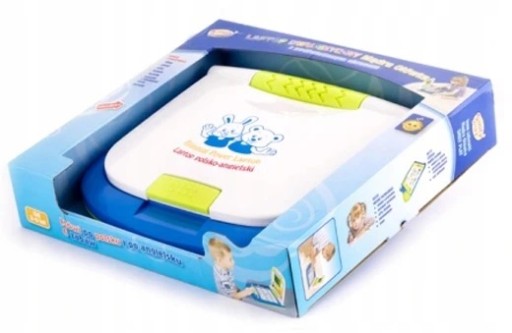 Laptop dwujęzyczny Mądra Główka z podświetlanym ekranem mówi po polsku i po angielsku. Ma 6 zabaw w dwóch językach. Dzięki dużemu podświetlanemu ekranowi dziecko bez problemów widzi co jest na monitorku. Laptop ma przycisk wyboru języka.